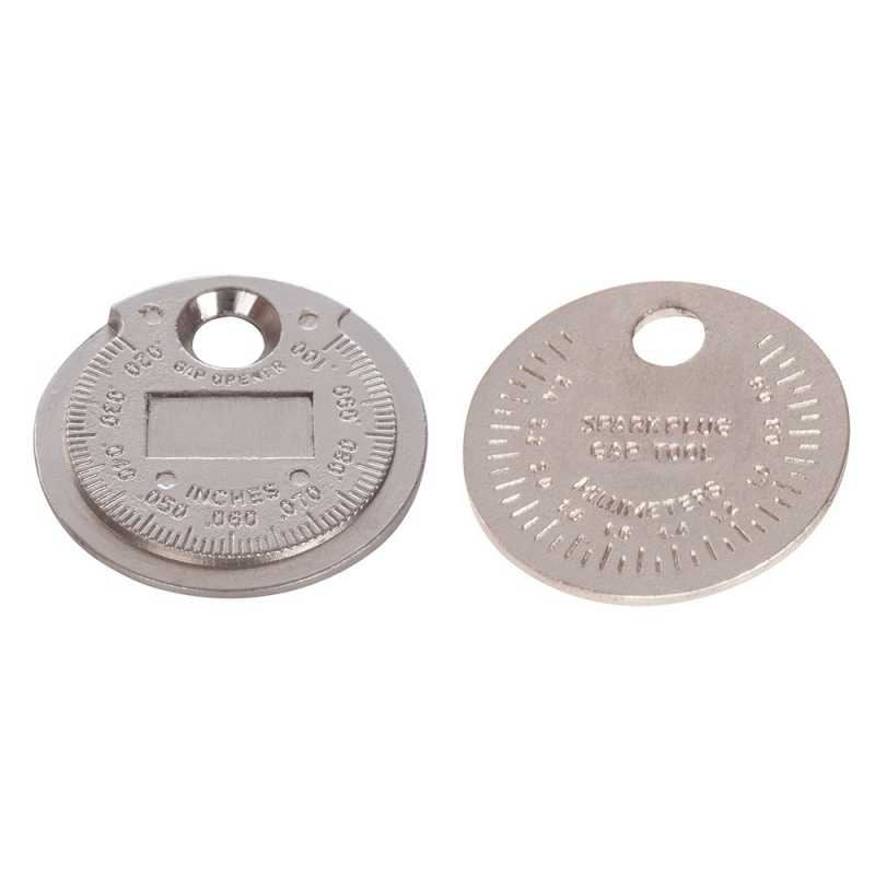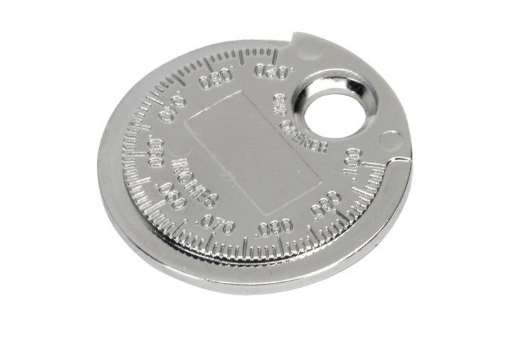 Spark plug gap gauge, made entirely of nickel-plated metal. Used to measure the gap between the electrode and the body of the spark plug.