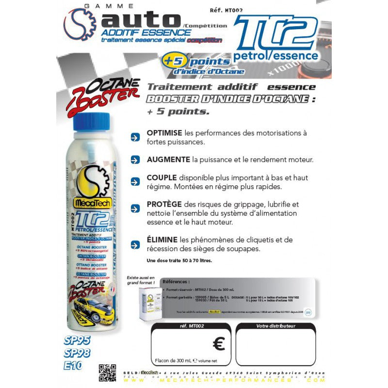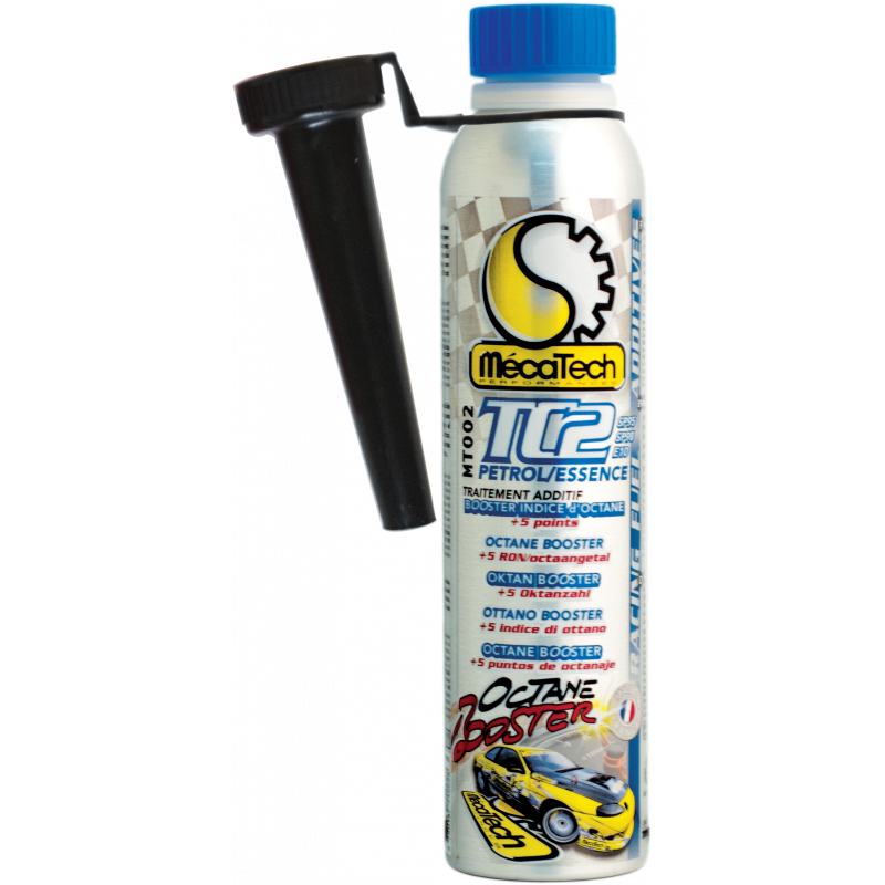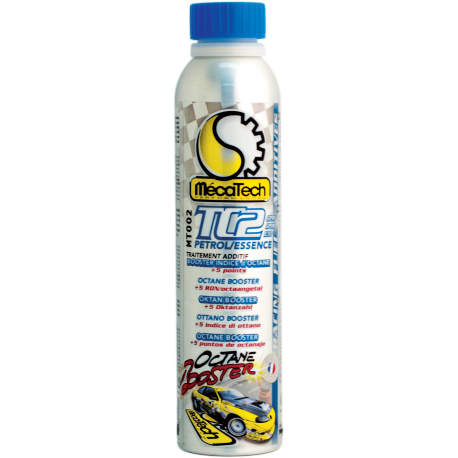Traitement essence booster d'octane. Augmente la puissance et le rendement moteur. Optimise les performances des motorisations à fortes puissances. Permet l'utilisation des carburants sans plomb (SP95 et SP98) dans les moteurs conçus pour le Super et l'essence plombée. Montées en régime plus rapides. Couple disponible plus important à bas et haut régime. Lubrifie et nettoie l'ensemble du système d'alimentation essence et le haut moteur. Protège des risques de grippage. Elimine les phénomènes de cliquetis et de récession des sièges de soupapes. Une dose traite 50 à 70 litres. Vol. net : 300 mL Réf. MT002